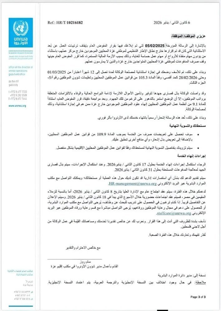 وجاء في التعميم الصادر عن مكتب الأونروا في غزة، تحت المرجع HR/T/10216182، أن القرار يأتي في إطار مراجعة دقيقة للوضع المالي للوكالة، وبناءً على أحكام أنظمة عمل الموظفين المحليين والمادة 9.1 الخاصة بإنهاء الخدمة لمصلحة الوكالة.